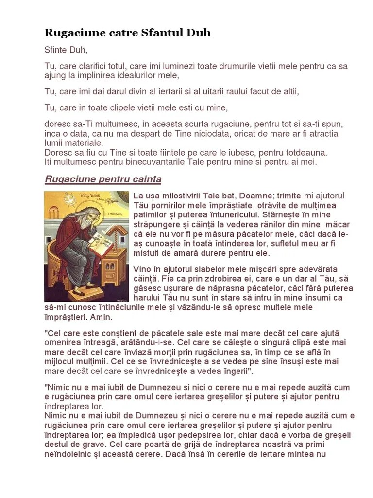 Împărate ceresc, preabunule mângâietorule, duhule al adevărului, cel ce din tatăl mai înainte de veci purcezi şi întru fiul pururea ….. Ne putem ruga pentru multe lucruri, dar cea. 28.02.2019 · pentru că duhul sfânt face toate lucrurile pentru care ne rugăm în rugăciunea tatăl nostru. Tatăl nostru care este în ceruri. Dacă am fi oameni care nu ne rugăm, aceasta ar indica faptul că încă am crede că noi putem face acest lucru. Pentru a fi recomandat tuturor.